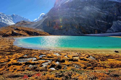 牛奶海是神山中的綠寶石,清瑩的牛奶海簇?fù)碓谌荷街?,湖水的顏色由黑到碧綠再到藍(lán)色,遠(yuǎn)遠(yuǎn)望去仿佛鑲嵌在群山中的綠寶石。