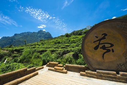 待日上三竿,陽光斜射穿越云霧,采茶姑娘身著客家服,藍黑格調(diào),綴以手繪圖紋,頭戴角形斗笠。嫣然而笑。瞬間清潤心間,討一捧新茶至云上茶居,沏茶邀友。