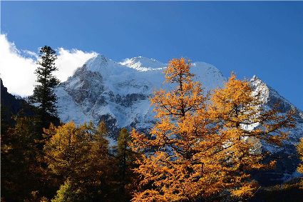 從稻城前往亞丁的路上會(huì)穿越川西風(fēng)光最美的彩色林帶,領(lǐng)略神奇的四季更替;洛絨牛場上的移動(dòng)牧群點(diǎn)綴在一片金黃之中,猶如浮動(dòng)的云朵,煞是好看。