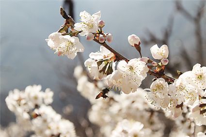 說起三月瀘定的美,可不止油菜花。在冷磧鎮(zhèn),純白如雪的櫻花也競相開放。它們花團錦簇,映著藍(lán)天,頗為壯觀。櫻桃花林中,簇簇花兒綴滿枝頭,潔白若仙。微風(fēng)吹過,滿樹搖曳,像極了千萬個精靈在春色中舞蹈。