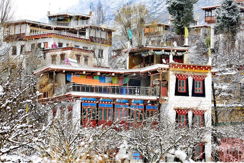 紛紛揚揚落下的雪,覆蓋在斑斕的彩林上,被太陽一曬,格外好看,來丹巴,享受愜意的暖陽吧!
