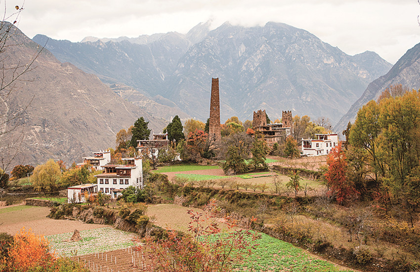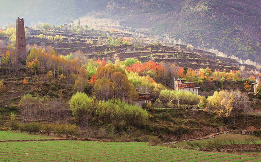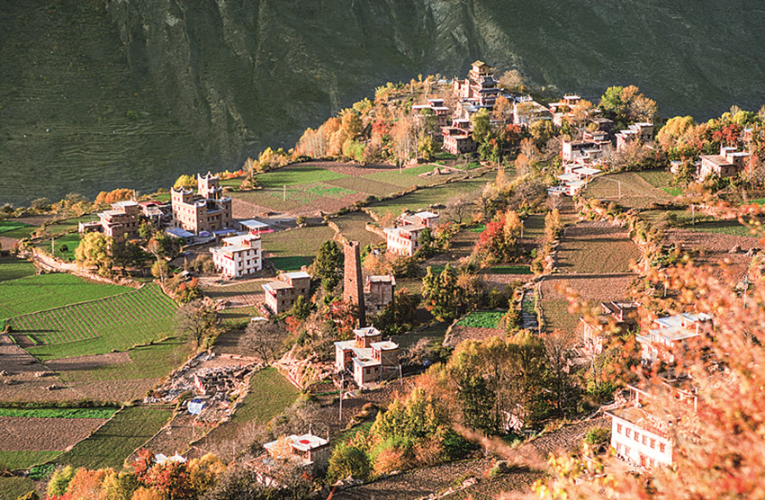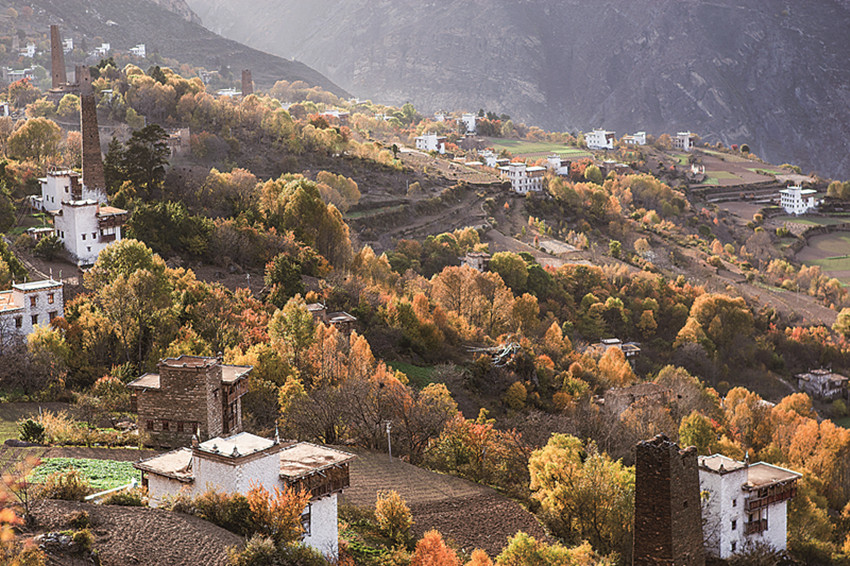 四季更迭,中路藏寨的魅力各異。秋天,正是藏寨最為絢爛的季節(jié)。造型獨(dú)特、別致的藏式民居,蜿蜒曲折的林間小道,組成了一幅美不勝收的畫卷。藏寨依山勢(shì)迤邐連綿,分布在相對(duì)高差近千米的山坡上,藏式樓房灑落在五彩斑斕的彩林中,與山谷、溪流、雪峰交相輝映,極富層次,構(gòu)成了一幅恬靜如詩的優(yōu)美畫卷。