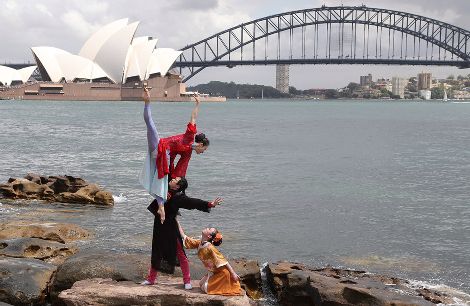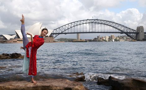 2014年2月17日,澳大利亞悉尼,中國(guó)女孩在悉尼歌劇院和海港大橋前跳起芭蕾舞。
