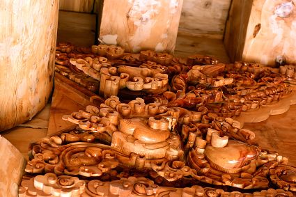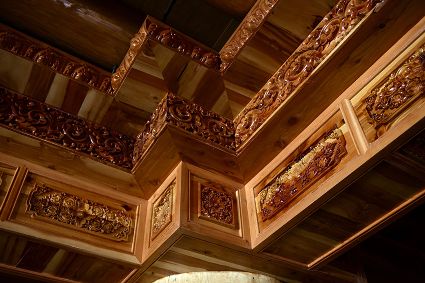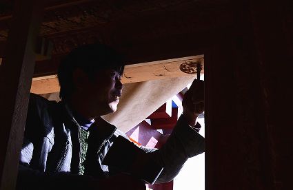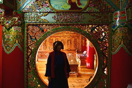 道孚民居的精華在其內(nèi)部,木材是其唯一的內(nèi)部裝飾材料,而裝飾,是一項繁瑣得曠日持久的藝術(shù)勞作,往往建房只需一兩個月,內(nèi)部裝飾則要幾年甚至幾十年。民間建筑藝術(shù)家們沉醉在細致入微的勞作里,讓每一個圖案都盈溢一份心底的吉祥,讓每一筆描摹都傳遞一份動人的傳說。房間四壁、房門和梁柱上一般都繪滿了精致典型的藏式壁畫,窗上分別雕刻著龍、鳳、仙鶴、麒麟等吉祥圖案。每間屋的大門上都鑲嵌醒目的兩個獅頭大銅環(huán),凸顯了與之相融的漢文化的特點。置身其間,色彩斑斕中,身邊盡是龍飛鳳舞,鶴翔麟躍。繽紛中細端詳,真是藏民族藝術(shù)的天堂!
