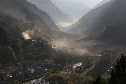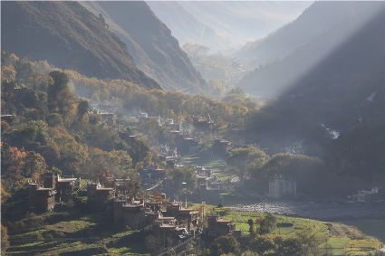 落日將最后一道霞光在山尖劃過,暗夜便裹挾這寒意搖動(dòng)起山林中的樹木。風(fēng)漸緊,那已經(jīng)稀稀落落的樹葉隨著風(fēng)的韻律,跳起歡快的鍋莊,仿佛在告別這一年的繁華。突如其來(lái)的大雪,給丹巴的二月涂上白色的記號(hào)。從山尖到院前的樹上,一溜兒雪白,正應(yīng)了“忽如一夜春風(fēng)來(lái),千樹萬(wàn)樹梨花開”的情景,讓人忍不住伸出手指看看這花是真是假。大雪過后,陽(yáng)光如約而至撒滿藏寨,金色陽(yáng)光和蒸騰的白霧縈繞在雪白的山頭,與山下的古碉藏寨,河畔的清流巧妙地構(gòu)成一幅絕美畫卷,讓人仿佛身處仙境。吸足了養(yǎng)分的柳樹終于抽出綠芽送來(lái)春天的信號(hào),那柳條兒在細(xì)風(fēng)吹拂下宛如少女對(duì)鏡梳妝,在陽(yáng)光下顯得無(wú)比溫柔,讓人不禁想貼近它們,感受這溫暖又靜謐的溫柔。