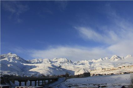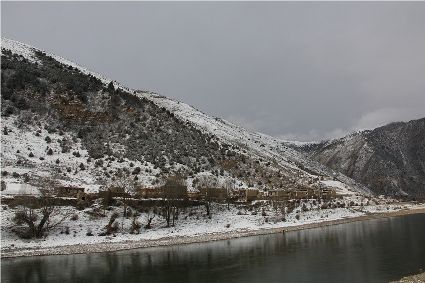 在接下來的路途中,停車休息的瞬間,一個(gè)臨水的村莊出現(xiàn)了。經(jīng)過昨夜的一場大雪,整個(gè)村子出人意料的“安靜”,河對岸牧民放馬的聲音,那個(gè)到河邊放下水桶汲水的女人取水的動(dòng)靜,似乎都被一場雪過濾了。我即使走到河邊,也難以通過耳朵和眼睛接近這一切。一幅無聲的畫面更貼近一場雪。我放下手中的相機(jī),似乎也在放下一些多余的東西,尊重著一種留白。