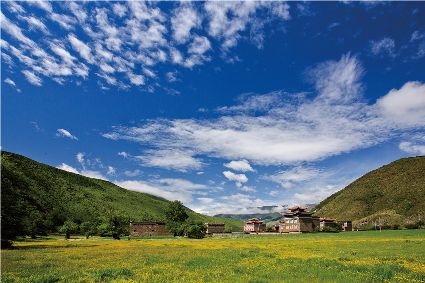 我們辦公室在樓的西北角,我開窗便是美景。晴空下細看,你會發(fā)現(xiàn)平均海拔3500多米的康定是那么大度而又不失親切,她將自己的美毫無保留地展現(xiàn)給世人。綠蔭屋檐之下近看,山中美景盡收眼底,芳草蔥蔥蘢蘢,藏房傳統(tǒng)典雅,山巖起伏跌宕,河水渾厚波折,水石交融,嫣然一幅別致的水彩畫。你不得不嘆服大自然的丹青妙筆。遠觀,青山巍峨連綿,壯人心志;大渡風流南去,蕩人胸襟,遠近轉(zhuǎn)變,山河如此多嬌,無論人心間有多少離愁別緒,只這一眼,瞬間淡忘于天地。