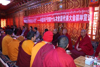 宣講團(tuán)成員勇勇用藏語激情洋溢的宣講黨的十九大精神,現(xiàn)場(chǎng)不斷響起熱烈的掌聲。當(dāng)勇勇講到我國五年來取得的輝煌成就時(shí),僧人們都激動(dòng)不已,紛紛為發(fā)展成就點(diǎn)贊?!奥犃私裉斓男v,我進(jìn)一步了解到了我們國家這些年來取得的發(fā)展成就。一直以來,黨對(duì)我們的關(guān)懷是看得見摸得著的,現(xiàn)在我們的寺廟管理越來越規(guī)范,基礎(chǔ)設(shè)施也得到了完善,通往寺廟的道路也有了明顯改善,我們的生活越來越好了,這一切都是共產(chǎn)黨的功勞?!彼聫R僧人尺乃表達(dá)著對(duì)黨的感恩。