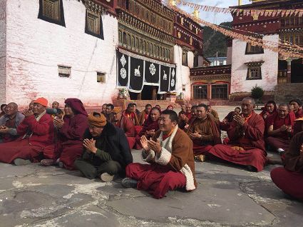 當(dāng)宣講組一行來到郭沙寺時(shí),寺廟僧人們?cè)缫哑炔患按牡群蛟谒聫R外?!奥犝f你們今天要來,我們?nèi)律舷露己芨吲d、很期待?!彼聫R堪布甲它激動(dòng)地說。