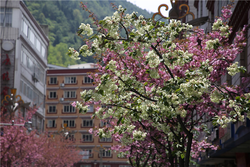 當(dāng)春天遇見最美的櫻花時,驚艷了整個康定。櫻花與身邊人都將成為春日里的浪漫風(fēng)景。櫻花之美,美在氣勢,櫻花紛飛,夢幻唯美。每年4月中旬,康定城北門的櫻花綻放后,人們像是約好了一樣聚集到這里,共赴這一場甜美盛宴。這一路繁花似錦,人們穿過枝椏花正盛的櫻花林,穿過粉色海洋,徑直奔向一個浪漫的童話,一路櫻花飄散,一路粉光燦爛。櫻花絢麗繽紛、陸續(xù)綻放,若恰逢一陣春風(fēng)經(jīng)過,櫻花瓣隨風(fēng)舞動,猶如紛落的雪花,空氣中浮動著櫻花特有的淡淡香氣,令人不禁懷疑自己置身夢境。“康定的春天來得要晚一些,綻放的櫻花,滿街的花草,折多河畔楊柳依依,康定的春天無比驚艷,醉了游人。”周先生一邊拍照,一邊感嘆,他在康定生活了40多年,20年前的康定,可以說找不到像樣的花草樹木,進(jìn)入新時代,康定城市變美了,城市綠化走在了前面,城市的美譽度舒適度不斷提升??刀ㄖ?,春色滿園,姹紫嫣紅,風(fēng)光旖旎。