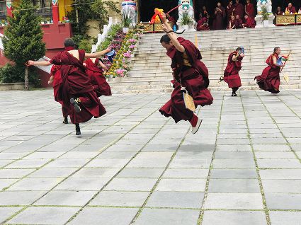 跳神儀式開(kāi)始,南無(wú)寺內(nèi)鼓號(hào)齊鳴,喇嘛身著顯耀盛裝,點(diǎn)燃新綠松枝,幾縷藍(lán)色煙紋升起。一支由法鼓、鈸、海螺、法號(hào)等組成的寺廟樂(lè)隊(duì)自大殿而出,順時(shí)針繞場(chǎng)一周落座場(chǎng)邊,群神出場(chǎng)繞圈而舞,以示凈化場(chǎng)地,祈請(qǐng)諸神入位。接著,象征護(hù)法神舞、骷髏舞、鹿神舞、黑帽咒師舞和金剛力士舞的演員手持各類(lèi)法器挨個(gè)入場(chǎng)手舞足蹈。舞蹈的起落根 據(jù)場(chǎng)邊奏響的器樂(lè)節(jié)奏進(jìn)行。最后由眾神驅(qū)鬼逐邪,押送“朵馬”(由糌粑捏成用以供神施鬼的食品)至寺外拋丟焚燒,以示驅(qū)逐一年的邪魔,祈禱來(lái)年安樂(lè)。