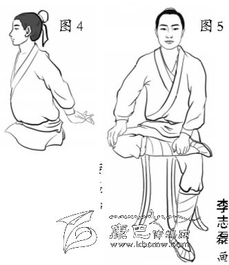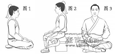 平坐。漢代以前,古人大多采用平坐,即以膝居地,小腿平置于地,臀部貼于腳后跟,就像跪坐一樣(圖1)。不管是在地板上,還是在床上,都采用這種坐法。平坐又叫正坐、安坐等,坐時(shí)身體挺直,眼睛平視,是最體面、權(quán)威的坐法。