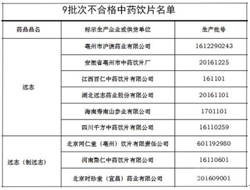 北京同仁堂(亳州)飲片有限責(zé)任公司、河南聚仁中藥飲片有限公司等企業(yè)生產(chǎn)的3批次遠(yuǎn)志(制遠(yuǎn)志)不合格,不合格項(xiàng)目為黃曲霉毒素。