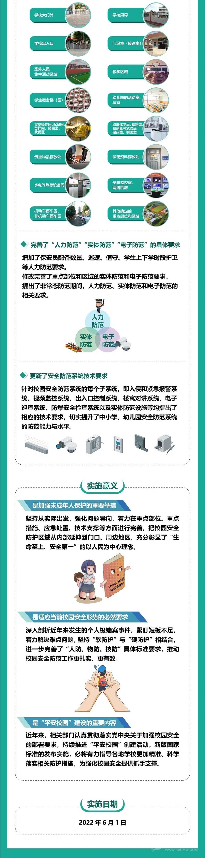 《要求》的突出亮點是,明確安全防范的重點部位和區(qū)域。堅持以“生命至上、安全第一”為中心理念,結合近年來國家和相關部門對中小學、幼兒園安全防護工作的系列部署以及校園的不同類型、規(guī)模,明確了安全防范的16個重點部位和區(qū)域,把校園安全防護區(qū)域從內(nèi)部延伸到了門口、周邊地區(qū)。