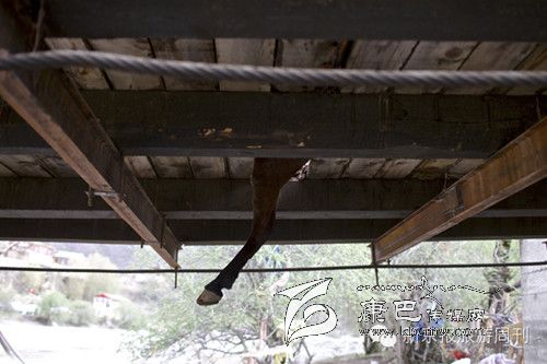 白玉縣,德沙村一鐵索橋,拉沙石馬隊(duì)中一匹騾子腿被陷進(jìn)漏空的木板下。