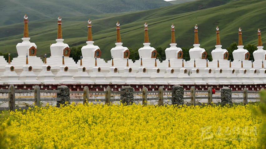 金黃的菜花與青山綠水、藏式民居相融,繪成一幅幅絕美的畫卷。據(jù)悉,道孚縣油菜盛花期將持續(xù)一個月。“油菜花開滿地黃,叢間蝶舞蜜蜂忙;清風吹拂金波涌,飄溢醉人濃郁香”。在漫山遍野金黃色的油菜花中,掩映著華麗的藏式建筑,使得每一個逃離紛繁城市的人都能找到歸宿。(圖片由中新社記者 劉忠俊 攝)