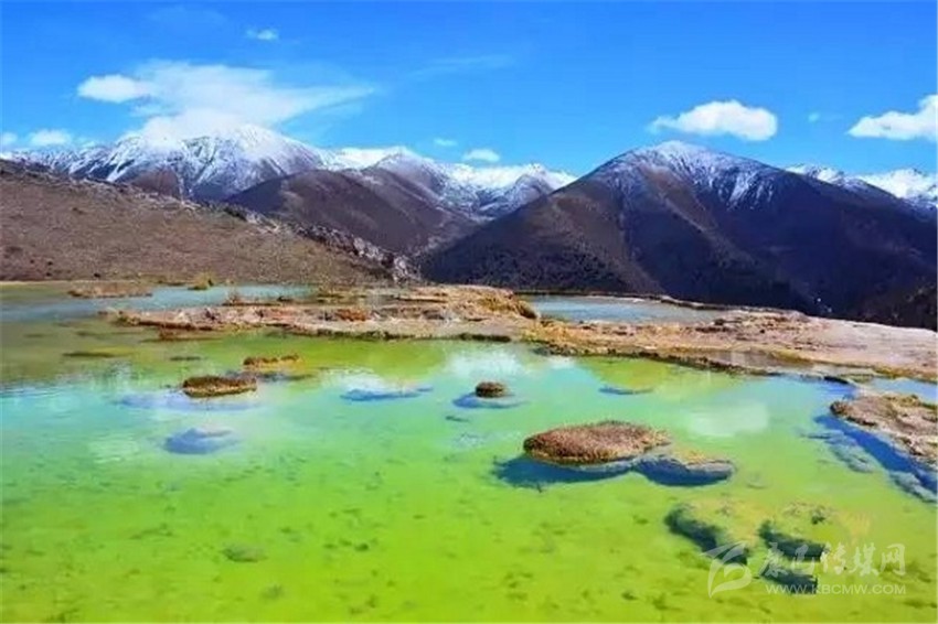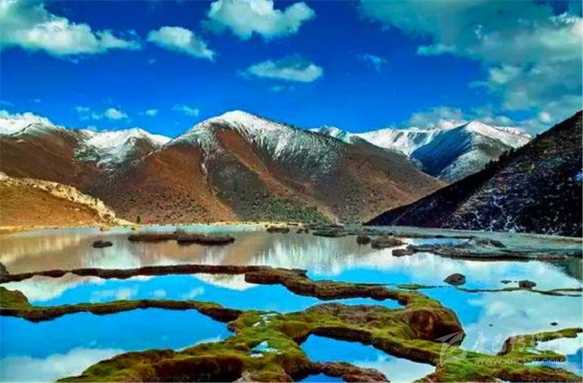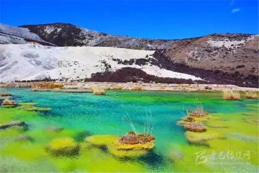 泉華灘海拔約4000米,屬于高山河谷草甸地貌。東南面就是貢嘎山,這里是觀(guān)看“蜀山之王”的絕佳位置。它因一種含有大量化學(xué)物質(zhì)的泉水在地表產(chǎn)生化學(xué)沉淀而成,從另一個(gè)山頭傾斜下來(lái)大片的白色鈣化土,延伸到谷底后便變化出四層五彩的鈣化池。每個(gè)階地上有十幾個(gè)大小不同、形態(tài)各異的五色彩池,水深40-70厘米,彩池里水草相依,石花點(diǎn)點(diǎn),疑為瑤池降臨人間!