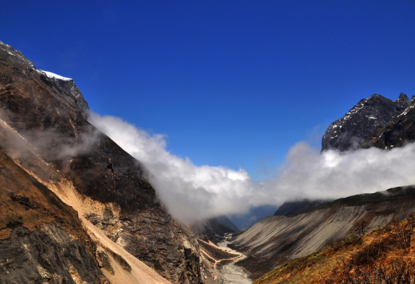 第二天,我們準備游玩燕子溝,醒來的第一件事就是拉開窗簾看看天氣,又一陣興奮,天氣依然非常晴朗,今天是進燕子溝的第一天,我早做足了準備,太陽帽、墨鏡、食品等等一樣不少。從磨西到燕子溝溝口的路程很長,需要坐景區(qū)的觀光車,因為天氣的原因,山上只有少些云霧繚繞,環(huán)在山腰,仿佛是一幅山水畫景。我們先來到了冰窖口,這里的海拔有三千多米,所幸大家都沒有高原反應,后坐車下山,來到有“定海神針”之稱的一棵高大筆直的杉樹。這棵杉樹皮粗厚,已經沒有了樹葉,樹枝也寥寥無幾,更顯滄桑。站在樹下遙望,顯得人是那么渺小。不禁讓人遐想這顆千年古樹的滄桑歷史。然后開始步行游玩,這里海拔比較低,走 起來不是很累,在城市中見慣了高樓大廈,車水馬龍的我們,此刻真有一種離開凡塵,來到世外桃源的感覺,我們一路依山而上,越走越高。我們終于來到了天藥水坪,這里的景色已經完全不同于山下,看著遠處的山,我們都不約而同地“哇”了一聲。