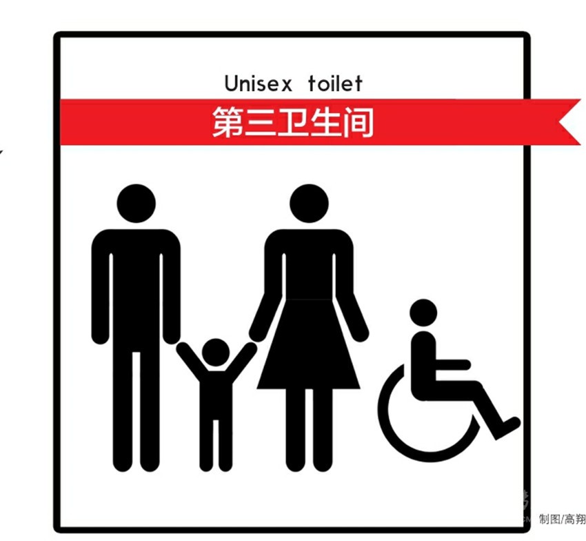 值得一提的是,四川的第三衛(wèi)生間還將有標(biāo)示?!锻ㄖ凤@示,該標(biāo)示上畫著一對夫妻牽著孩子,旁邊還有一個坐著輪椅的行動不便者。在畫面下方,注明了“第三衛(wèi)生間”字樣,英文“Unisex toilet”意為“無性別廁所”。 (據(jù)四川在線)