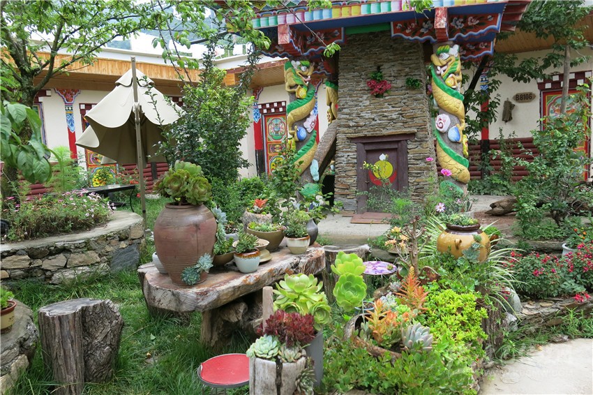 這座民宿坐落于克格依村,緊鄰原生態(tài)田園,庭外滿目青翠、古碉林立,庭內(nèi)花草滿園、瓜果飄香,時(shí)而傳來一聲鳥鳴,更顯園中幽靜。民宿的前臺既是游客接待中心,也是一座小型的博物館,展示著古宅數(shù)代主人的精心收藏。