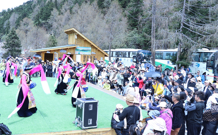 春雪消融,大地復(fù)蘇,高原上肅穆的景色正變得郁郁蔥蔥、多姿多彩起來。5月1日,康定情歌(木格措)風(fēng)景區(qū)天氣晴好,高山杜鵑在山澗中次第開放,景區(qū)內(nèi)人流如織,游客有的是一家老小有說有笑,有的是三五好友打卡拍照。行走在高山湖泊造就的自然環(huán)境中,耳畔是鳥兒和河水流動(dòng)的和聲,信步林間,牧歌牛群,木格措清凜可人。在木格措觀景臺(tái),還上演了14場藏族非遺歌舞,歡快的舞蹈和秀麗的風(fēng)光讓游客沉醉其中、留戀忘返。
