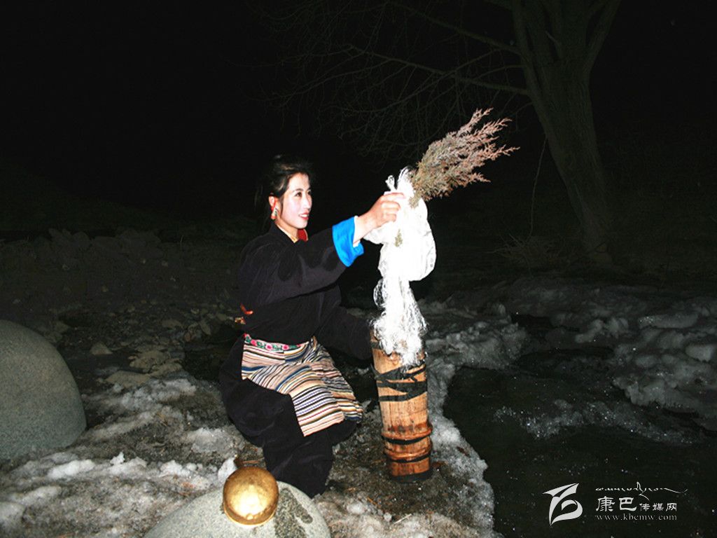 在除夕這天,家里的婦女會把庭院,房屋重新打掃一遍。把垃圾再清理一次。因?yàn)榱?xí)俗認(rèn)為,初一掃地和除垃圾會把一年的財(cái)運(yùn)和好運(yùn)都掃走。這天,大人小孩還要忙著洗頭、洗澡,搞好個(gè)人清潔衛(wèi)生。而除夕之夜最重要的一個(gè)儀式是“搶頭水”。(新年的第一桶水—晨星水)。傳說,晨星水是人間最吉祥的水。它可以獻(xiàn)神,可以潔身,可以祛病,洗滌一切污垢和不祥,帶來平安和幸福。從除夕夜十二時(shí)開始,一個(gè)個(gè)懷抱柏樹枝和哈達(dá)的姑娘或小伙子們披著繁星,爭先恐后地去背晨星水。第一個(gè)先到河邊的要熏燃桑煙,并用哈達(dá)繞上柏樹枝蘸水向空中拋灑三次,并把柏樹枝放在河邊。背回的晨星水首先要供奉佛祖。然后才可以用來燒茶、洗漱。而家里的五谷斗上則盛滿了糌粑、炒青稞粒、人參果等食品,上插青稞穗,也有在八寶碗里用糌粑和五彩酥油做成“切巴”,供奉在佛堂里。這一切都是為了祈禱來年風(fēng)調(diào)雨順、人畜兩旺、喜獲豐收。除夕夜,在正房桌子上還要擺上各式油炸果子、牛肉坨坨、糖果以及青稞美酒、飲料等等美味佳肴,開始迎接新年的到來。