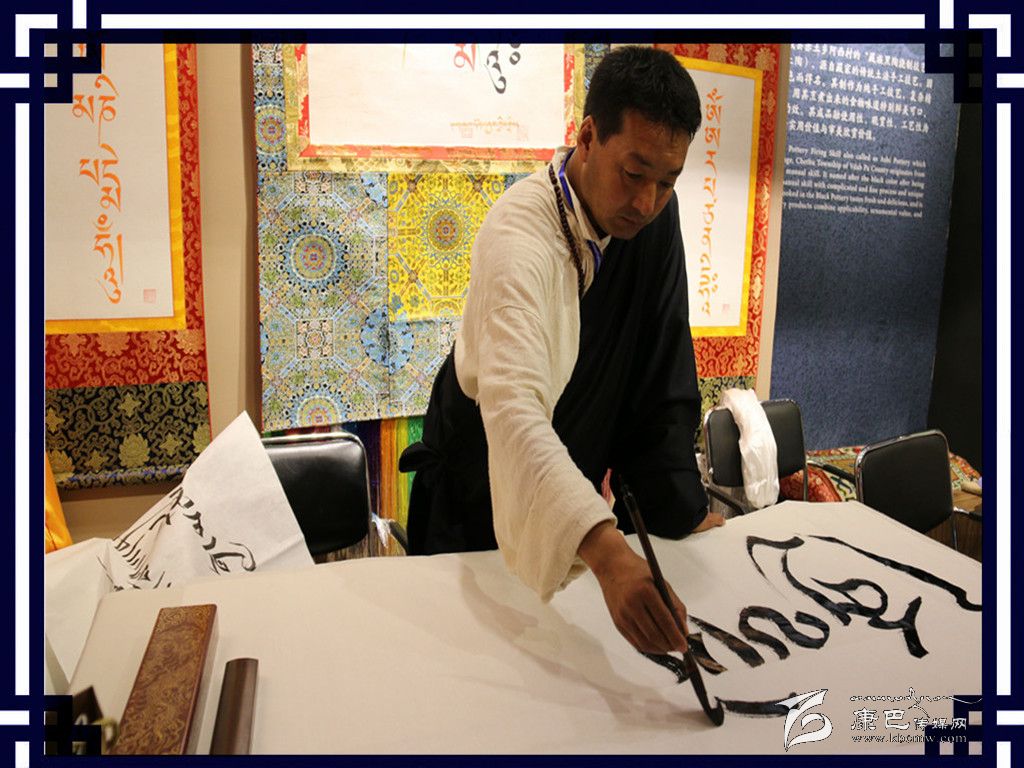在藏文書法展示區(qū),來自甘孜縣的藏文書法家巴桑鄧珠正在為前來參觀的群眾展示書法技藝,巴桑鄧珠瀟灑地拿著藏文書法專用的排筆上下?lián)]舞,不一會白紙上便呈現(xiàn)出清秀的藏文書法。