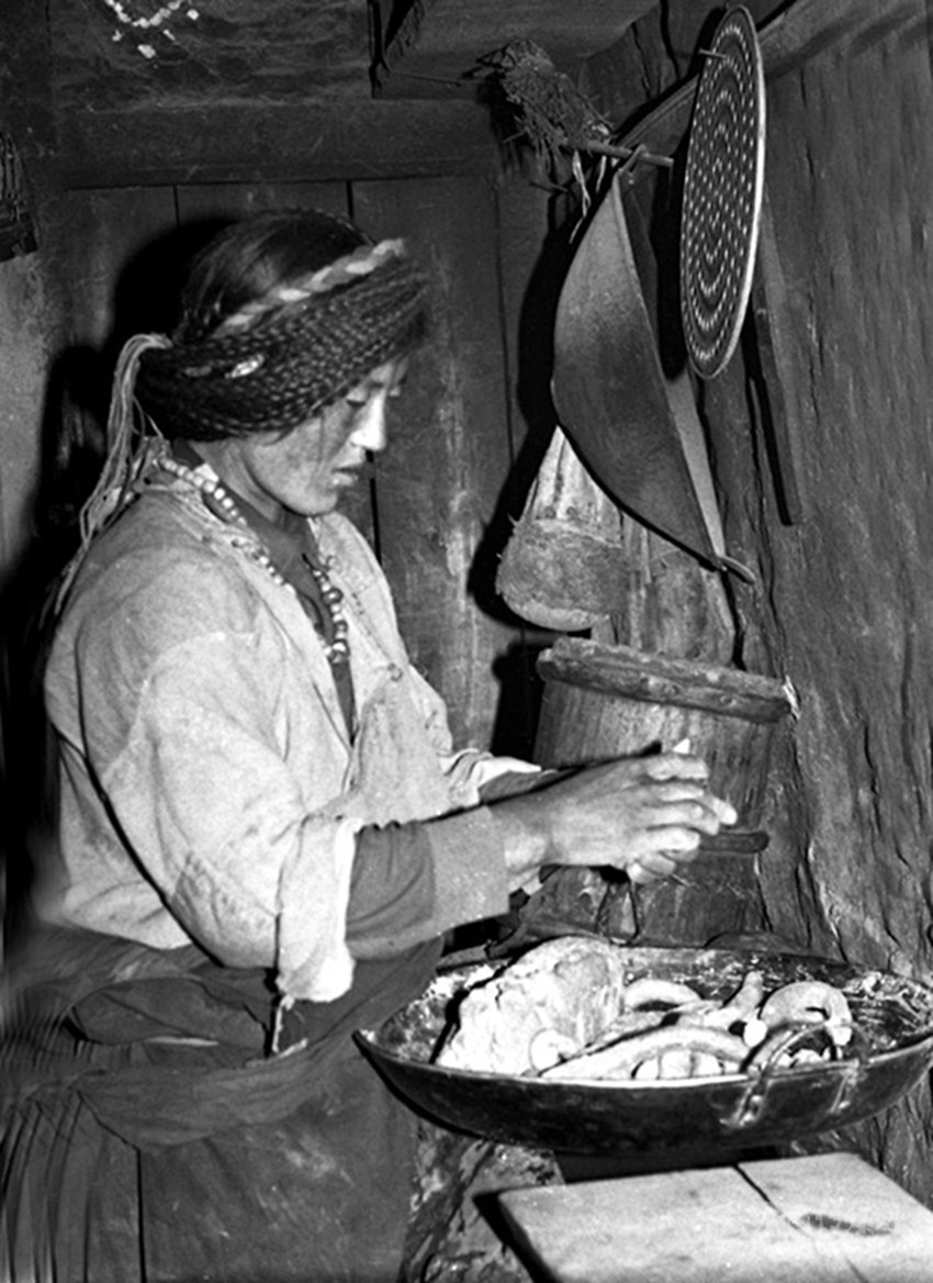 再就是有腌制酸菜的好手—魚通婦女。魚通女,多是“大腳丫頭”,高大壯實,堪稱“女漢子”,且善良賢淑、憨厚能干,里里外外拿得起放得下,看不到一點“窈窕淑女”的影子。所以早年康定地方流行這樣的“禪話”:“大風(fēng)塆的風(fēng),瓦斯溝的蔥,要討婆娘到魚通”。高高山上的魚通女,“任你溜溜的求喲!”。