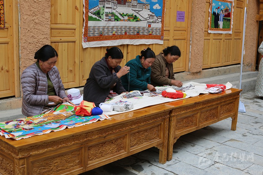 在藏繡展點(diǎn),5名農(nóng)牧民婦女正在合繡一幅藏族建筑刺繡作品?!拔覐?6歲開始跟著父親學(xué)藏繡,傳到我這已經(jīng)是第四代了。除了‘六長(zhǎng)壽’、度母像等傳統(tǒng)圖案,今年是新中國(guó)成立70周年,我還繡了一幅天安門作品?!?7歲的傳承人達(dá)打介紹道。