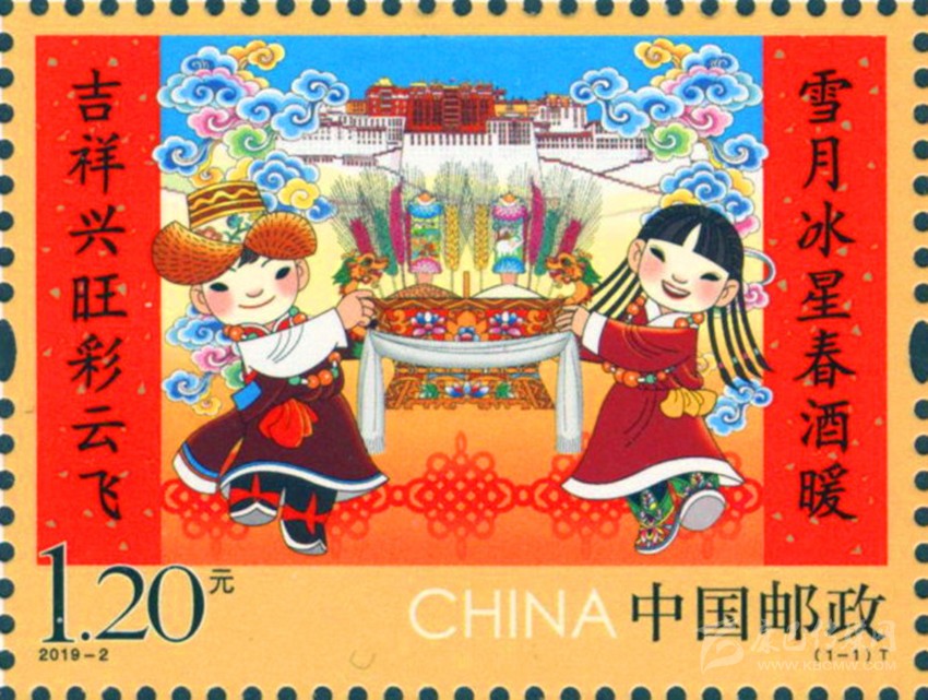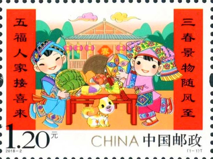 彰顯中華民族特有人情味的拜年郵票。拜年是我國春節(jié)的主要習(xí)俗,是中華民族優(yōu)秀的傳統(tǒng)文化,是人與人之間情感凝聚和維系的重要禮節(jié),具有獨(dú)特人情味。中國郵政從2015年至2019年連續(xù)發(fā)行了五組“拜年”系列郵票。2015年中國郵政發(fā)行的第一組《拜年》郵票,以其獨(dú)特的卡通風(fēng)格和濃郁的民俗特色,展現(xiàn)了人們過大年,拜大年時(shí)的喜悅場景。2018年正好是廣西壯族自治區(qū)成立六十周年,中國郵政發(fā)行 《拜年》郵票,畫面展現(xiàn)了壯家人過年時(shí)熱情好客的場景,桌子上擺放著柚子、香蕉、五色飯等當(dāng)?shù)靥厣褪澄?,打開的石榴籽粒飽滿、顆顆相抱,正如我國56個(gè)民族緊密團(tuán)結(jié)在一起,形象貼切地體現(xiàn)了習(xí)近平總書記提出的“各民族要像石榴籽那樣緊緊抱在一起”的教導(dǎo)。 2019年春節(jié)恰逢與藏歷新年同一天,中國郵政發(fā)行的《拜年》郵票,郵票主圖畫面上“歡歡”與“喜喜”兩名藏族兒童,身穿藏族的盛裝,在布達(dá)拉宮前載歌載舞,整個(gè)畫面展現(xiàn)了藏族同胞歡快愉悅,喜慶新年的畫面,同時(shí)也表達(dá)了全國各族人民在黨的領(lǐng)導(dǎo)下,幸福生活,共筑中國夢(mèng)的美好寓意。