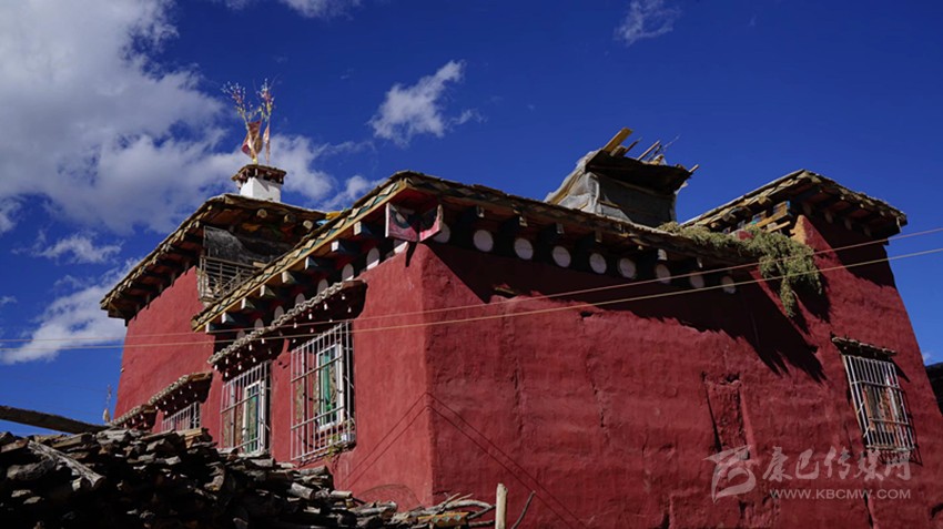 外裝飾也不繁復(fù)。外墻用磚紅色粘土調(diào)成泥漿上色,現(xiàn)在多用化學(xué)顏料。大門用一種叫“抓”的天然礦物質(zhì)涂料,這種顏料容易染色,挨一挨都會讓衣服沾上絳紅色,現(xiàn)在也用化學(xué)涂料代替。二樓與“砸口樓”檐口處裸露在外面的木頭,用漆絳紅色顏料涂抹,支出來的小圓木涂白色顏料。遠(yuǎn)遠(yuǎn)望去,紅白相間,錯(cuò)落有致,巴塘方言藏語稱之為“東椎”。檐口頂上用排成“人”字形的小青瓦點(diǎn)綴,窗框和門框都涂成絳紅色,也用“東椎”與青瓦裝飾;有條件的人家安裝雕花窗棱,嫌麻煩就用普通的大格子窗。外置庭院,種花植木,一座傳統(tǒng)的紅藏房便竣工了。