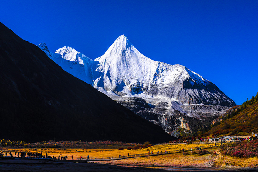 走過山走過水,觀一路秋色,描摹一生的畫卷。在亞丁的晚秋,可以感受“遠看山有色,近聽水無聲”的畫面,在亞丁的晚秋,可以體驗“愁因薄暮起,興是清秋發(fā)”感覺。在亞丁的晚秋,總會有李清照那句“秋已暮、紅稀香少。水光山色與人親,說不盡、無窮好”在腦海浮現(xiàn)??偢袊@景色太美,文筆笨拙,要是“俱懷逸興壯思飛,欲上青天覽明月”的李白在“抽刀斷水水更流,舉杯消愁愁更愁”的多愁善感里描繪三怙主的雄奇與牛奶海的柔美,那不知道又是一個多么驚世駭俗的偉大手筆?沒有也許,只有在些許的缺憾中努力書寫屬于這個秋的一切。是的,秋已暮,珍珠海的水碧波不興,雪山的倒影更顯雄偉與圣潔。秋已暮,五彩山林和潺潺流水纏綿無盡,已經把美輪美奐的山水畫鋪展在天地間。秋已暮,牧歸炊煙起,草原已寂靜。