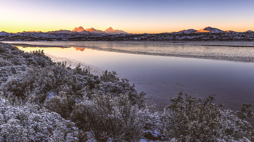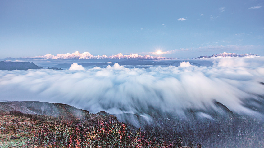 這是天上貢嘎寬大為懷、兼容并包的不凡氣度。它以獨具魅力和氣吞山河的雄偉壯麗,以及無法憾動的王者之軀,包容并呵護著無數(shù)群峰、千溝萬壑、萬物生靈和諧共生共處,展現(xiàn)出一幕幕眾山拱衛(wèi)下精致的山岳大戲。如此這般,既把自身推向了高點,又使依偎在身邊甚至遠處的萬物生靈各得其所、各展其長、各有所獲。
