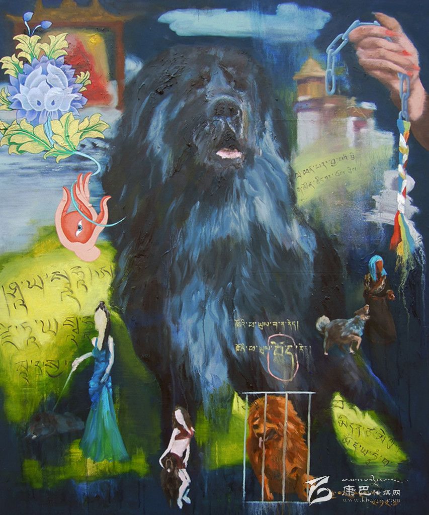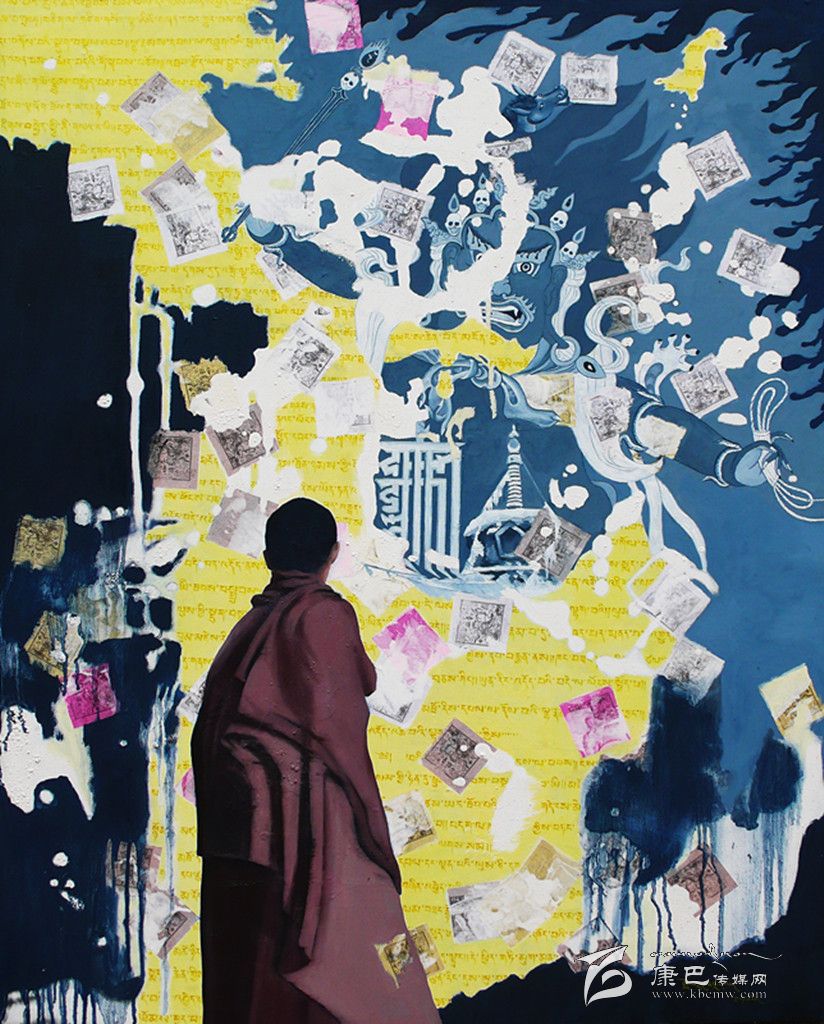采用藏區(qū)題材做藝術(shù)的藝術(shù)家不在少數(shù),強(qiáng)調(diào)寫實、原汁原味是大部分藝術(shù)家的選擇,但生于康定的藝術(shù)家周韜卻有另一番更深入的認(rèn)識。與美國印第安藝術(shù)家Brad kahlhamer一樣,他用更加強(qiáng)烈動態(tài)的視覺制造了一個魔幻世界,讓眾人熟悉的藏區(qū)元素在畫面上集中而豐富地跳躍起來,比如喇嘛、活佛、長辮子的藏族女人,甚至形狀怪異的骷髏!