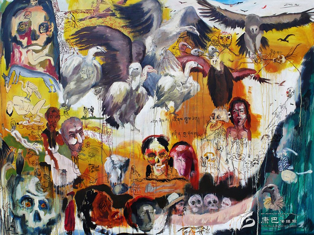 心態(tài)的豁達(dá)使周韜明確創(chuàng)作風(fēng)格后,很自然地創(chuàng)作了以藏區(qū)文化為主題的油畫系列,比如《沐浴節(jié)》、《活佛》、《天葬》、《女孩和她的夢》。比如,在《天葬》里周韜大量使用各種狀態(tài)的骷髏,對此他的理解是“從有些人來看,它可能代表了某種邪惡,但是從民族文化和精神層面來理解,它是藏區(qū)文化的一部分,也是藏族人對生命的一種觀看方式,比如藏戲和法會中就有專門的骷髏舞。”