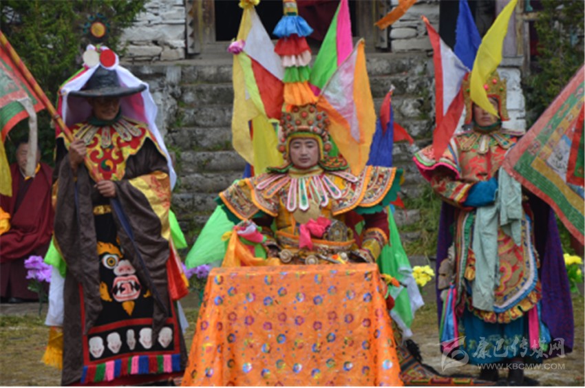 思路還是回到戲劇問題上來,在我以往欣賞的藏戲,其演出場所都設(shè)在露天,演員和觀眾在同一平臺的草地上,有時在平臺四周有山坡,那便是觀眾最好的看戲處。不過,從高處往低處看,效果還是不及平視的效果好。表演藏戲的舞臺在草地中央,觀眾圍著中央草地形成一個半包圍圈,演出幾乎沒有布景,即便有,也是簡單的一些桌椅、祭臺之類的簡單道具。在演出中,一個演員身著各類色彩鮮艷的帽、旗及其盔甲服裝等大于人體體型的飾物,這樣做的目的顯然是為了增強演出的鮮明性,尤其演員穿著厚底高靴,體型龐大,頭戴面具,嗓音洪亮,動作凝重而富有節(jié)奏,使整個演出富有較強的穿透力和沉重感。藏戲的音樂也比較簡單,主音節(jié)奏依靠長號、大鼓、鈸等,曲目轉(zhuǎn)換時則多以笛子演奏,間或插入海螺聲、嗩吶聲等。整個藏戲的故事情節(jié)則是依靠舞蹈和合唱來漸次推進的。藏戲作為祖國文化大家庭中的成員之一,自然有著自己獨特的特點,有著屬于自身的文化藝術(shù)和生活土壤的傳承因子。藏戲誕生在一個特殊的環(huán)境里,它既在風(fēng)格、形態(tài)、特征和韻致上包含著與其他戲劇相似的共通性,同時,它又蘊涵著與眾不同的自身的內(nèi)涵特征。總之,藏戲在“歌、舞、劇、技等方面的有機結(jié)合,虛擬寫意的表現(xiàn)型戲劇,程式化表演手段,自由靈活的演出時空概念,??????它又具有與古希臘戲劇很類似的貫穿始終的講解人和伴唱伴舞隊,面具表演,三面以至四面觀眾的廣場演出,一部分生活化寫實表演,演出時空的間接固定場景,史詩式講唱文學(xué)的劇本結(jié)構(gòu)和說唱藝術(shù)的演出格式等特殊之處?!薄緞⒅救骸吨袊貞蚴贰?/span>4頁】因此,在藏戲的諸多元素中,我們可以看到顯著的特征,這就是明顯的原始巫文化和原始苯教文化的痕跡,無論是在藏戲的臺詞、面具和服飾中,還是在藏戲的音樂、樂器和表演形式上,不難看出藏戲的這一本土特征,至于與其他戲劇流派的類似之處,我以為,一方面是戲劇本身固有特征的表現(xiàn),另一方面或許是一種合理吸納所致。
