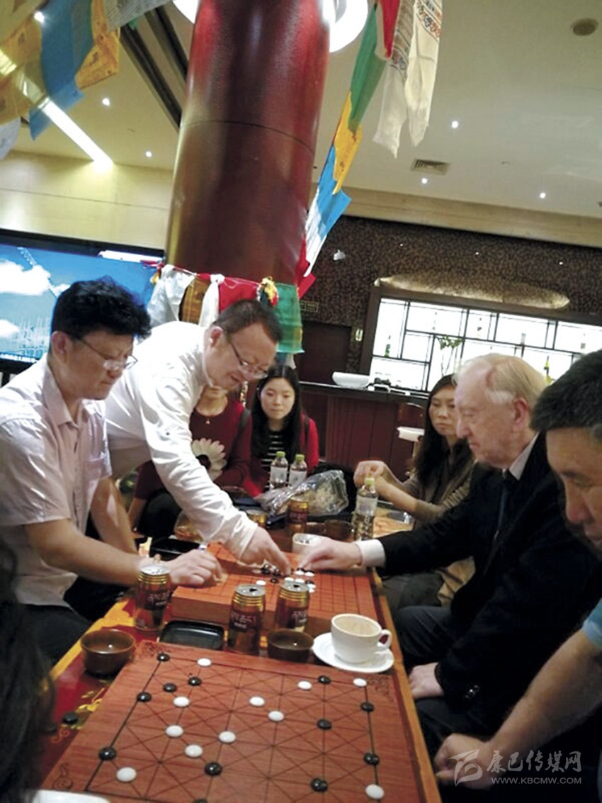 藏族群眾與外國藏棋研究學者交流藏棋文化。