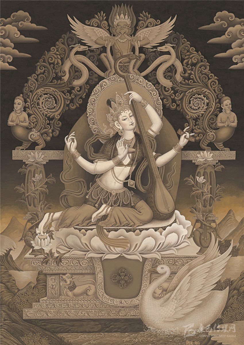(一)對比色調:畫面顏色干凈,對比強烈,大多用對比色來彰顯力量;施金華麗、燦爛而不泛濫。(二)暗色調:畫面明度較低,常用黑色、藏青、絳紅、深綠來調劑各類原色,使得畫面色彩沉郁中透露出清新、凝重中綻放出優(yōu)雅,色彩的過渡細膩而豐富。(三)素色調:尼瓦爾唐卡最有特色的就是“素色調”的唐卡(簡稱“素唐”)。筆者之所以稱其為“素色調”而不稱作“黑白”或“單色”,是因為畫面雖然沒有明顯的色彩,但是也非單一的黑色或灰色。它不僅調配了從深到淺的許多色階;還有雅致的黃灰、曠遠的藍灰、宏大的紅灰等諸般色相的交響以及微妙的冷暖搭配,整體呈現(xiàn)出夢幻般的美感。