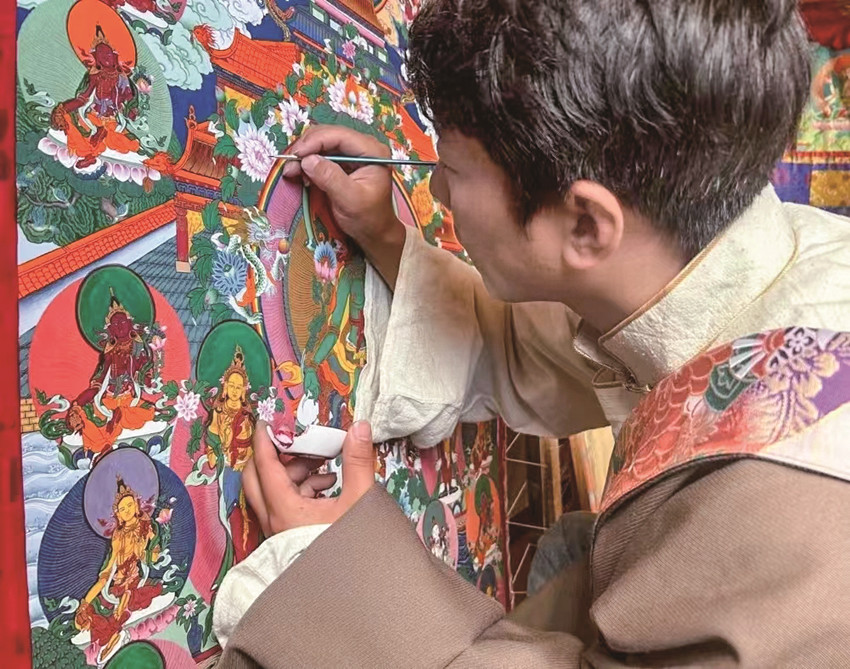“唐卡作為中國民族繪畫藝術(shù)的珍品,不僅呈現(xiàn)精湛的技藝和美學(xué),更是傳遞一種文化?!睏畹潜硎荆鳛橐幻h級非遺傳承人,要在繼承傳統(tǒng)技藝的基礎(chǔ)上,采用多元藝術(shù)技藝賦予傳統(tǒng)唐卡更多創(chuàng)意,讓民族文化瑰寶能夠更好地發(fā)揚(yáng)光大。