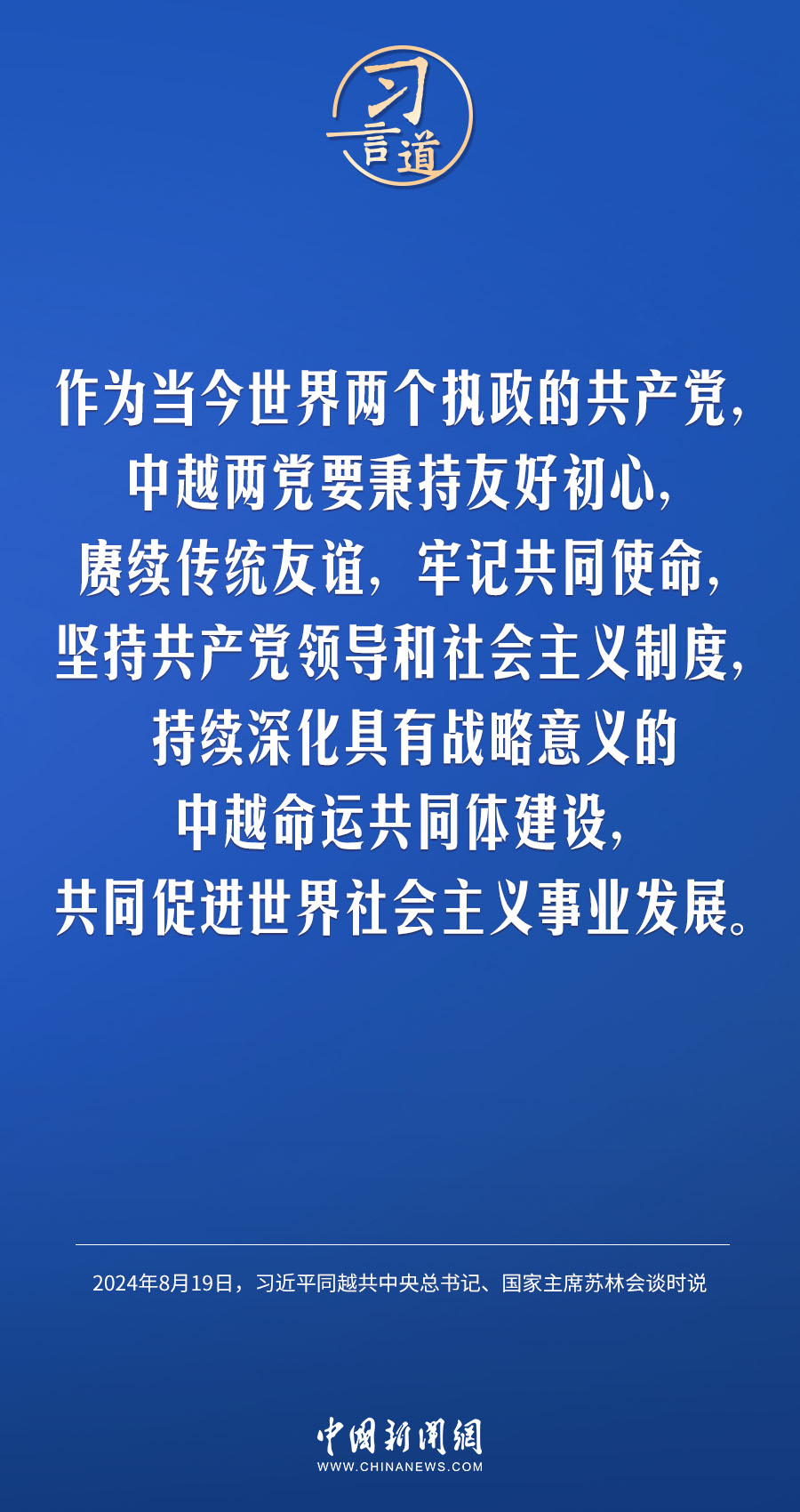 8月19日,中共中央總書(shū)記、國(guó)家主席習(xí)近平在北京人民大會(huì)堂同來(lái)華進(jìn)行國(guó)事訪問(wèn)的越共中央總書(shū)記、國(guó)家主席蘇林舉行會(huì)談。習(xí)近平指出——