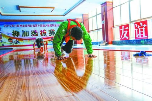 在甘孜,押加又稱“大象拔河”。傳說(shuō)格薩爾王在一次出征回朝的途中,發(fā)現(xiàn)了上千頭牦牛,便讓手下的大臣們將腰帶套在脖子上,四肢支撐于地,模仿大象拉車那樣,兩人一組進(jìn)行拔河比賽,然后根據(jù)比賽結(jié)果分配牦牛。格薩爾王是藏民族文化中英勇豪邁的象征,由此可見(jiàn)展現(xiàn)強(qiáng)健的體魄和英勇的氣質(zhì)是押加運(yùn)動(dòng)文化內(nèi)涵之一。