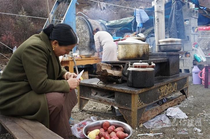 在四川甘孜藏族自治州白玉縣金沙鄉(xiāng)安置點,八吉村村民在準備午飯(11月17日攝)。新華社記者 張海磊 攝
