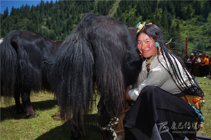 德格牧民歡喜擠牛奶。 龔自華 攝