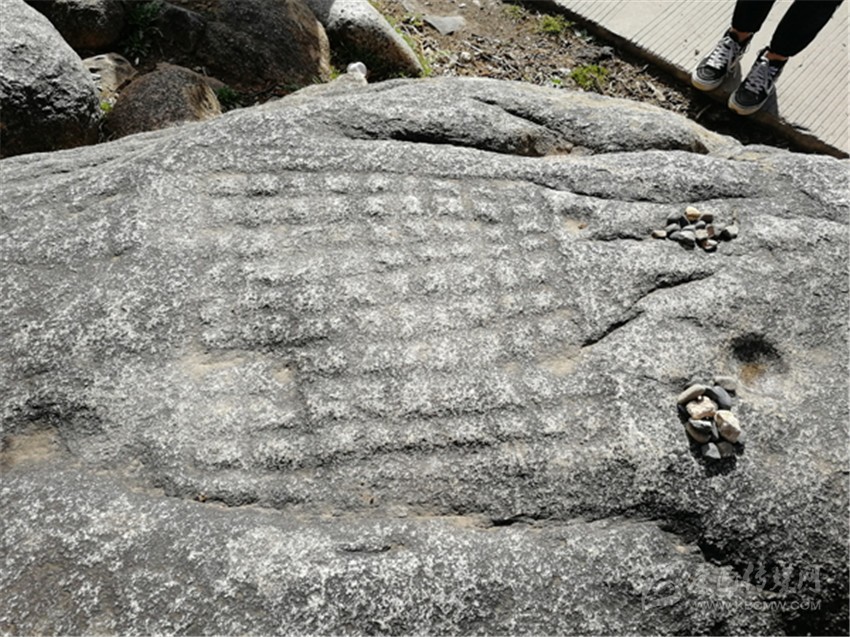 此次發(fā)現(xiàn)的唐蕃時(shí)期藏棋石刻棋盤距離甘孜縣城約30公里,沿國(guó)道317線甘孜縣向德格縣方向卡公鄉(xiāng)境內(nèi)。石刻位于公路約500米處,在1處約300余平方米、深1.6米左右的露天溫泉傍。棋盤刻在一塊重約2頓,巖面近1.5平方米花崗石表面中央,巖面整齊的刻著2.5厘米的格子,縱橫各10道線,在棋盤的左右對(duì)角兩邊,還刻有裝棋子的圓形石孔,類似于現(xiàn)今的圍棋盤。