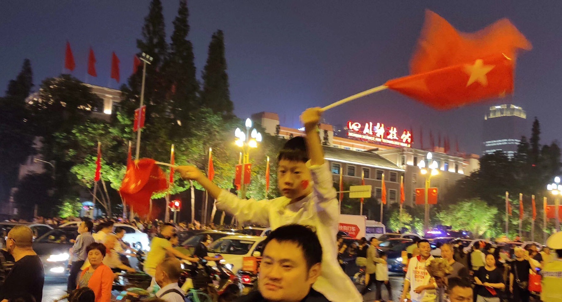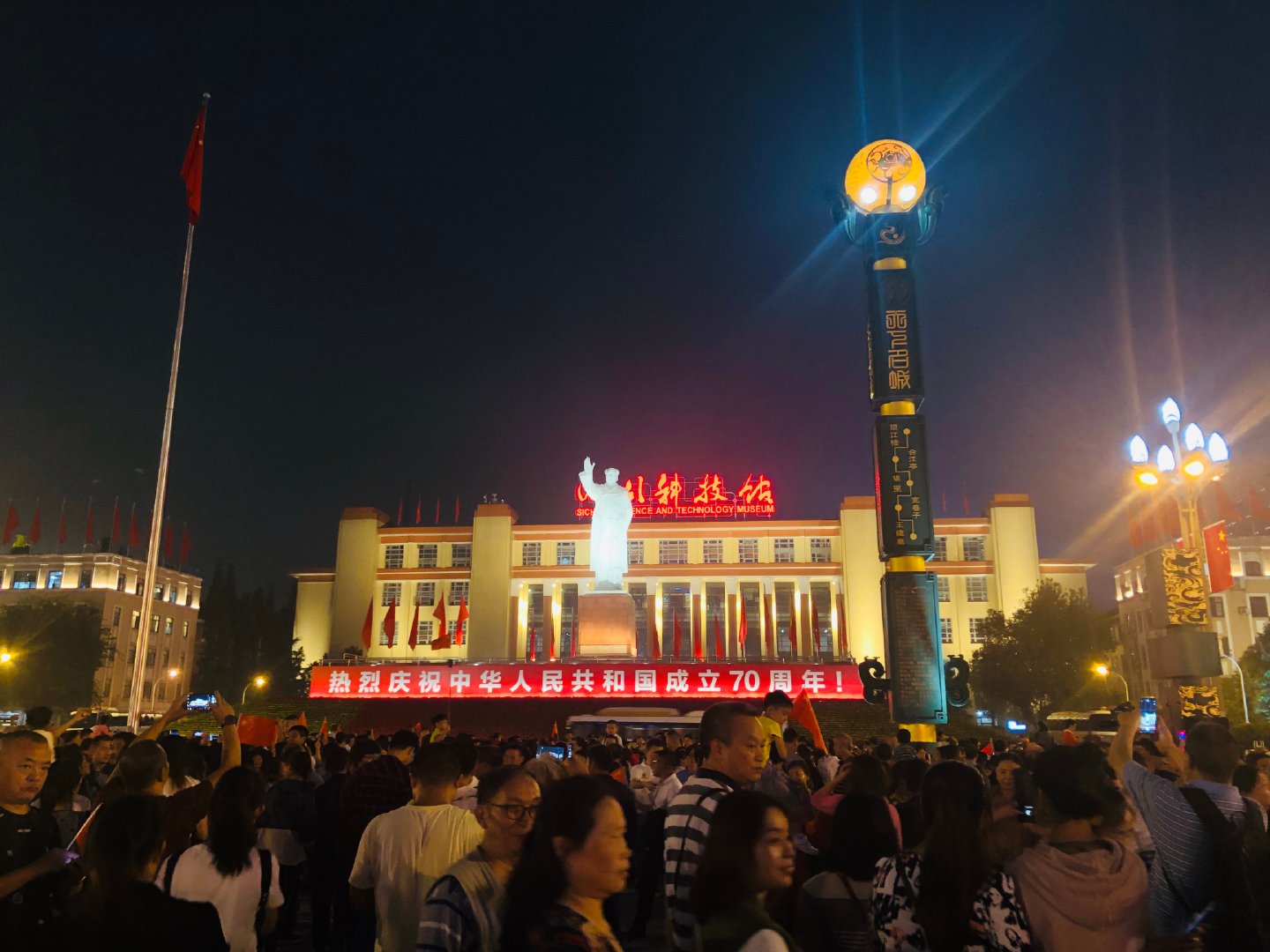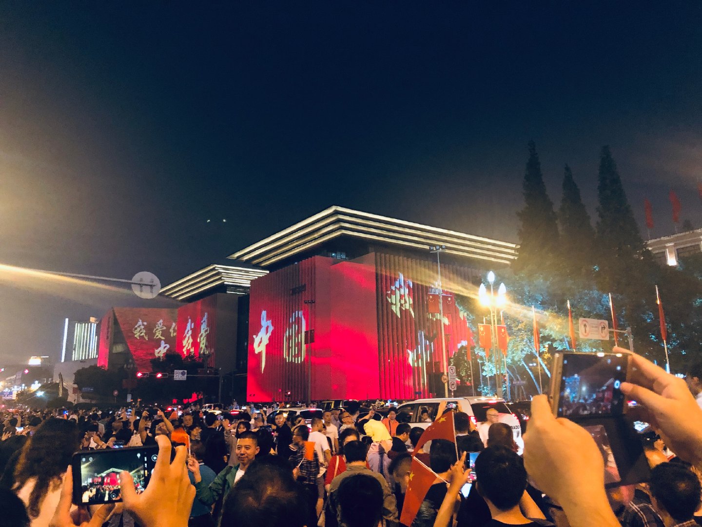 為慶祝新中國成立70周年,成都市開啟超級(jí)夜景模式。四川大劇院、四川美術(shù)館、四川省圖書館、成都市博物院等建筑被大型投影包裹,美輪美奐!群眾紛紛拍照留念,還有群眾激動(dòng)地在現(xiàn)場(chǎng)合唱《我和我的祖國》,祝福祖國母親生日快樂。