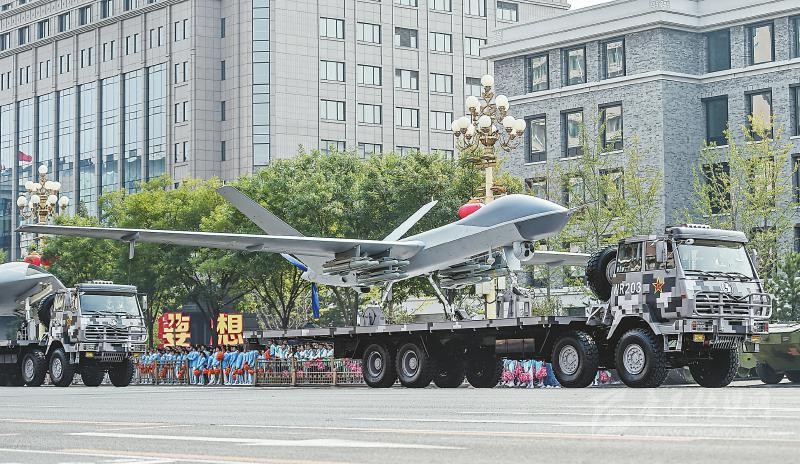 在兩輛指揮引導車帶領(lǐng)下,由攻擊-2無人機、攻擊-11無人機和反輻射無人機組成的無人作戰(zhàn)第2方隊通過天安門,向世界展示了中國無人作戰(zhàn)平臺的又一嶄新成就。