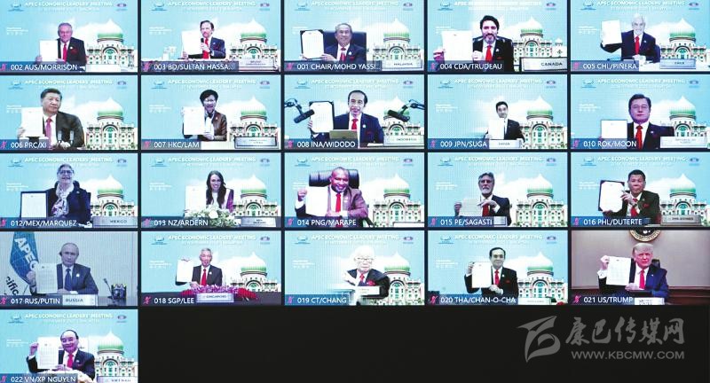 這是與會各經(jīng)濟(jì)體領(lǐng)導(dǎo)人、代表通過《2040年亞太經(jīng)合組織布特拉加亞愿景》并線上合影。新華社記者 李響 攝