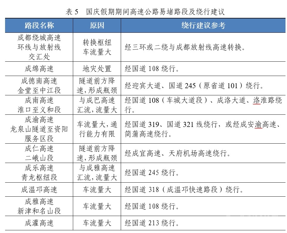 預(yù)計(jì)車流量主要圍繞成都等中心城市呈放射狀分布。節(jié)日期間,成都市周邊各主線站以及連通主線站的環(huán)線高速車流量最為密集,假期出行主要方向集中在成都往德陽、眉山往內(nèi)江、內(nèi)江往自貢、成都往雅安、成都往都江堰以及成都往重慶方向。