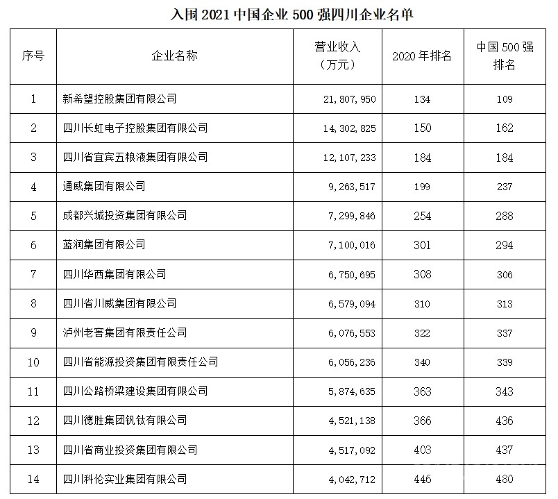 2021年四川有14家四川企業(yè)入圍中國(guó)企業(yè)500強(qiáng),較上年減少1家。新希望控股集團(tuán)有限公司以21,807,950萬(wàn)元的營(yíng)收成為進(jìn)入中國(guó)500強(qiáng)的四川企業(yè)首位,總排名109位,比去年上升25位。其余入圍企業(yè)名單如下。