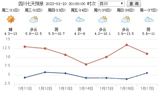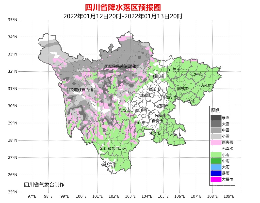 預計12日晚上到13日白天,盆地各市陰天,部分地方有小雨或零星小雨,西部北部高海拔地區(qū)有雨夾雪;川西高原和攀西地區(qū)陰天間多云有陣雪(雨),局部地方有中到大雪。